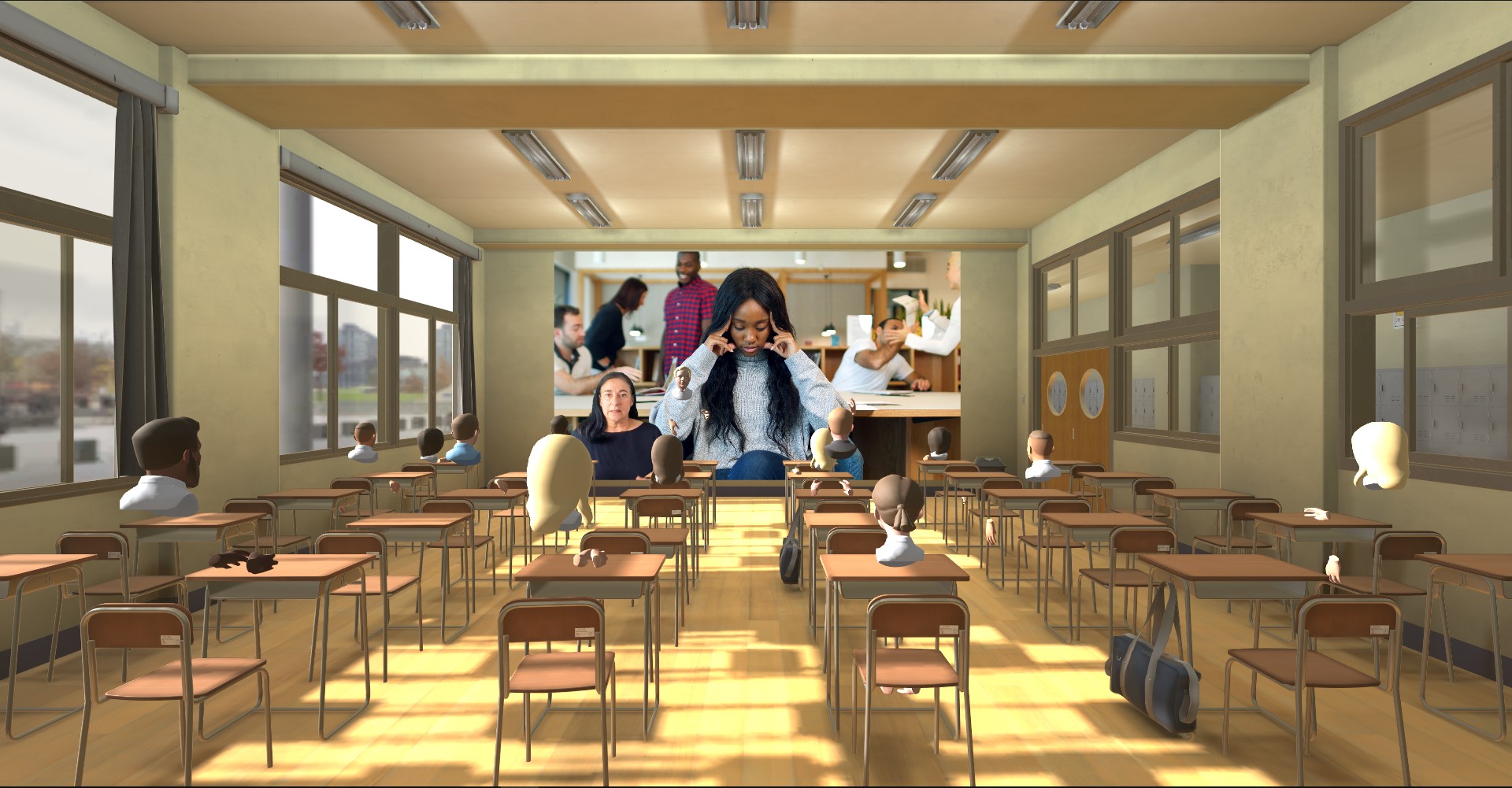The image above is a screenshot from the actual virtual reality experience. In the classroom students can sit down at desks and see a tutor presenting a class to them in VR. The teacher in real life puts on a VR headset and are immersed into the experience. Here the teacher can present slides, visit the internet or share videos on the big screen behind the teacher in front of the classroom.